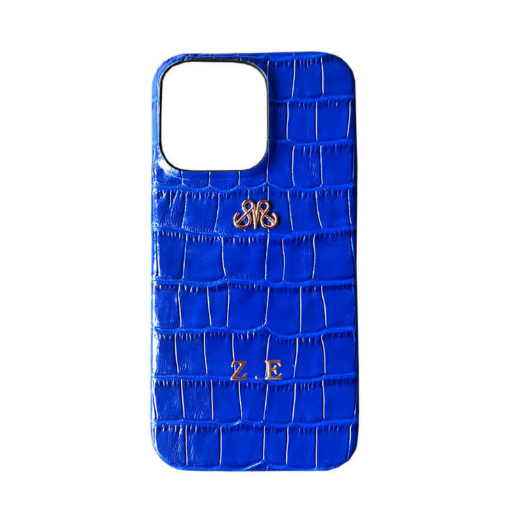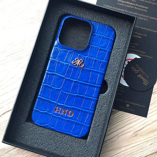 Deri iPhone Kılıf 13 Pro Saks Mavi Croco Full Deri
